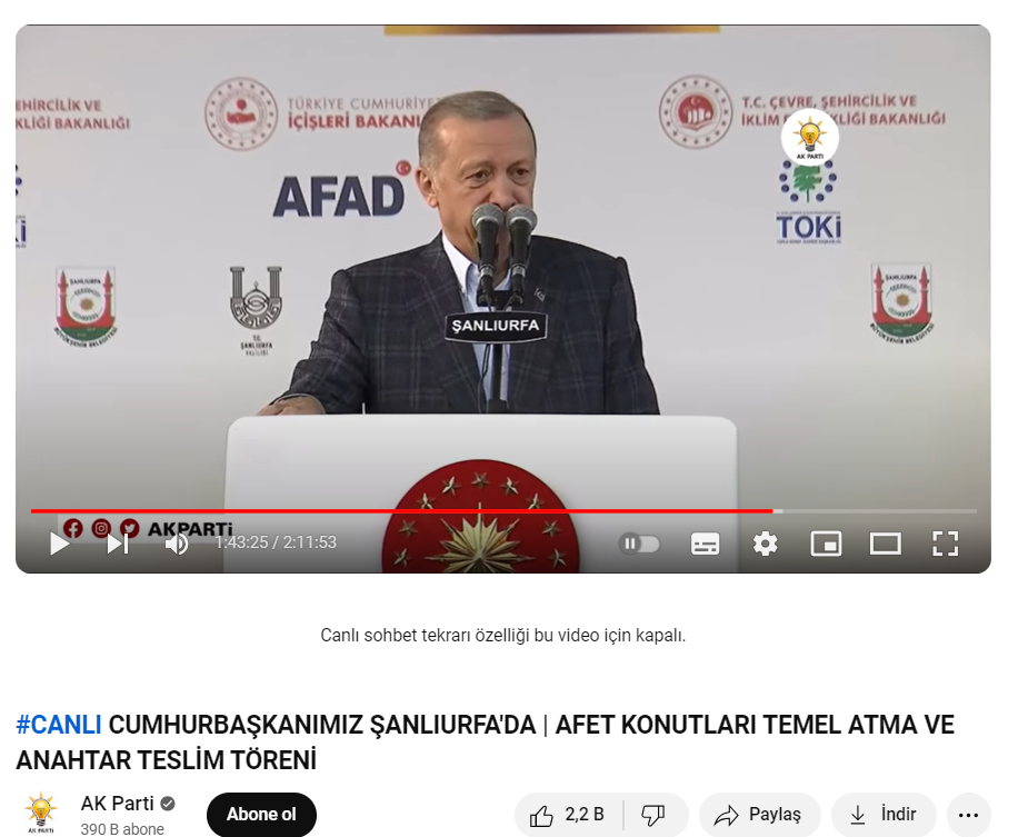 Cumhurbaşkanı Recep Tayyip Erdoğan, aynı iddiayı daha önce de dile getirmişti. 14 Mayıs 2023 Cumhurbaşkanı ve 28. Dönem Milletvekili Genel Seçimi‘nden önce, 16 Nisan 2023’te Şanlıurfa’da gerçekleşen Afet Konutları Temel Atma Töreni’ne katıldığında konuşmasında şu sözlere yer vermişti: