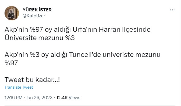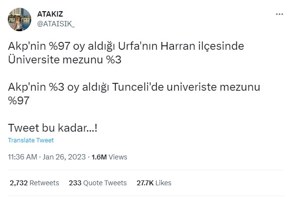 Sosyal medyada oy oranları ve seçim sonuçlarıyla ilgili bir ilin ve bir ilçenin karşılaştırıldığı iddialar ortaya atıldı. İddiaya göre AK Parti, üniversite mezunu oranının %3 olduğu Şanlıurfa’nın Harran ilçesinde %97 oy alırken üniversite mezunu oranının %97 olduğu Tunceli’de ise %3 oy almış.