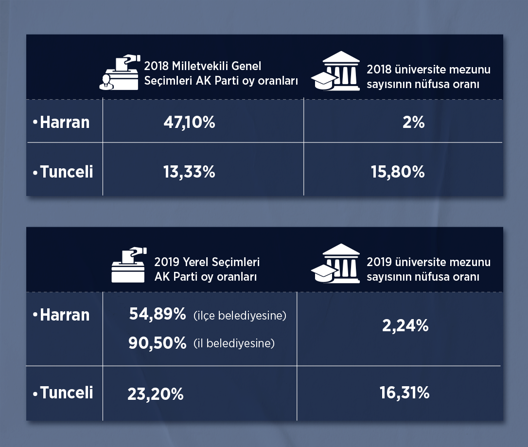 - 2018 Milletvekili Genel Seçim Sonuçlarına Harran ve Tunceli özelinde bakıldığında AK Parti’ye verilen oyların oranı %97, üniversite mezunu oranı da %3 değil.