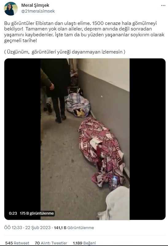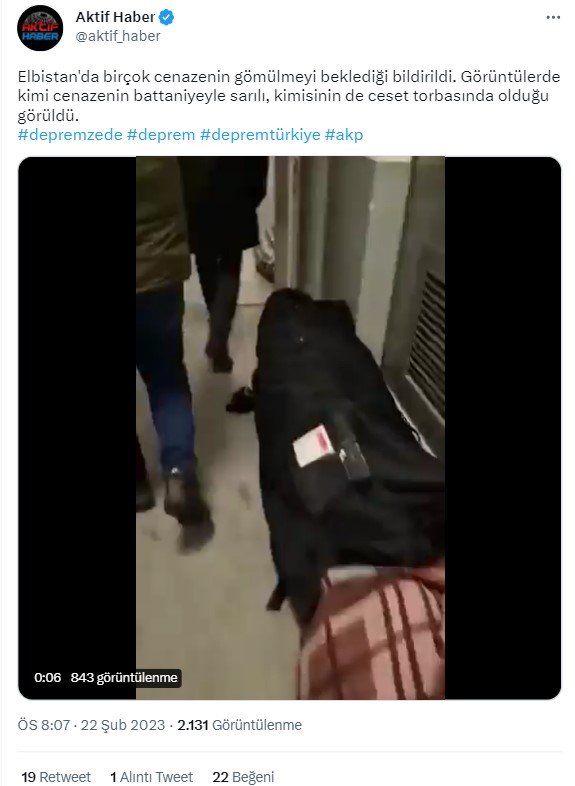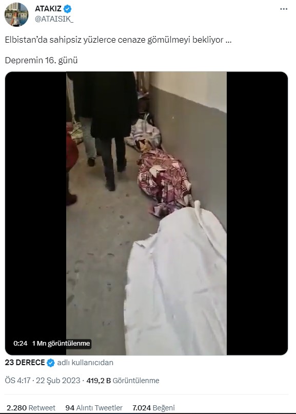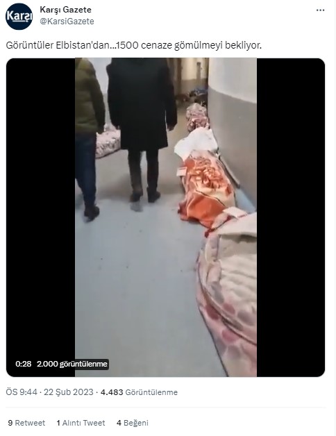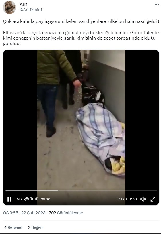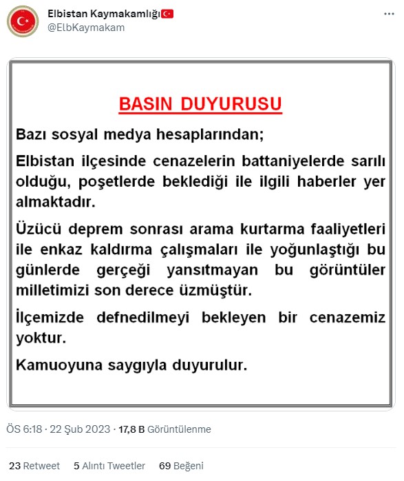 Bunun yanında Elbistan Kaymakamı Hasan Hüseyin Vural’ın da görüntülere ilişkin yaptığı açıklamada, depremin dördüncü günü itibarıyla bekleyen cenazenin kalmadığını belirtmiş. Elbistan Kaymakamlığının Twitter hesabından yaptığı açıklamayla da bu bilgi doğrulanabiliyor.
