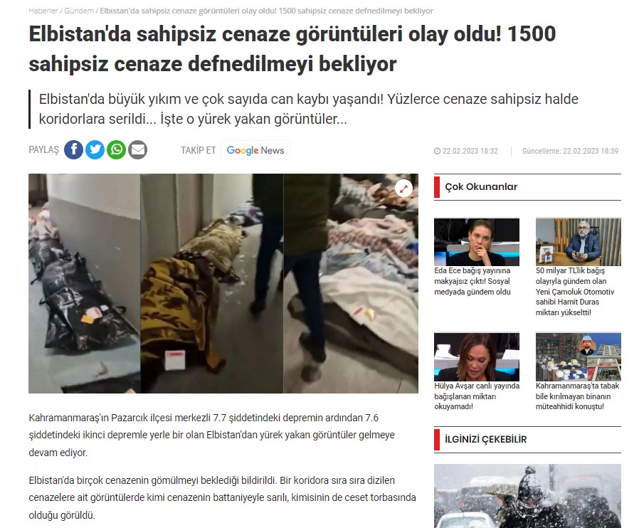 Yaşanan depremlerin ardından sosyal medyada çeşitli yanlış ve yalan bilgilerde dolaşıma girdi. Sosyal medyada yayılan görüntülerde, Kahramanmaraş’ın Elbistan ilçesini gösterdiği iddiasıyla bir paylaşım yapıldı. Bir paylaşımda görüntünün depremin 16. gününü gösterdiği öne sürüldü.