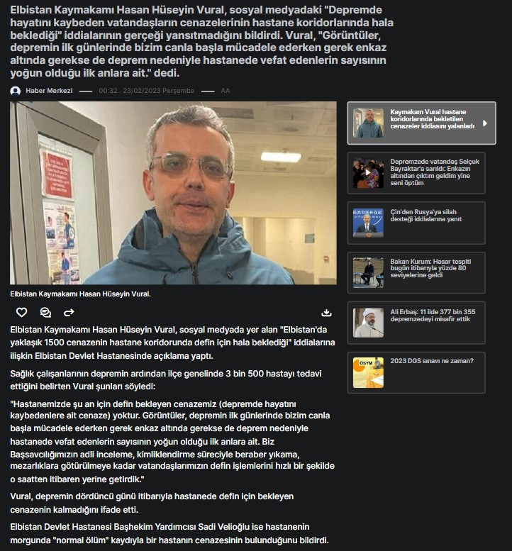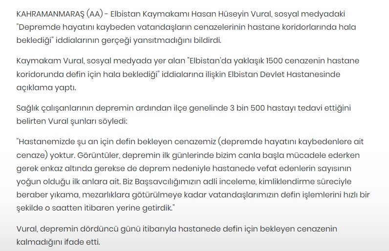 Söz konusu görüntüler üzerinden araştırma yapıldığında, güncel görüntülerin olmadığı anlaşılıyor. Elbistan Kaymakamı Hasan Hüseyin Vural’ın, videonun yayılmasının ve güncel gibi algılanmasının ardından açıklama yaptığı görülüyor. Vural bekletilen cenaze görüntülerinin güncel değil, depremin ilk günlerine ait olduğunu ifade etmiş. Bununla birlikte Vural, hastanede şu an için depremde hayatını kaybedenlere ait cenaze yoktur açıklamasında bulunmuş.