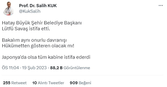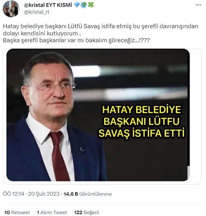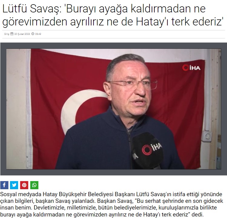 Sosyal medyada Hatay Büyükşehir Belediyesi Başkanı Lütfü Savaş’ın istifa ettiğine dair ortaya çıkan bilgilere karşı araştırma yaptığımızda, Lütfü Savaş’ın açıklama yaptığı anlaşılıyor.
