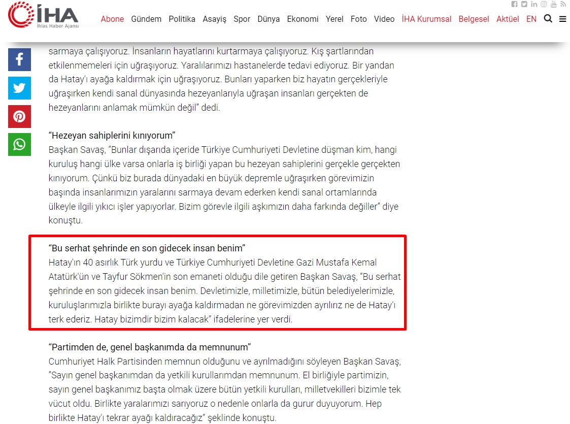 - Savaş, “Burayı ayağa kaldırmadan ne görevimizden ayrılırız ne de Hatay’ı terk ederiz.” ifadeleriyle iddianın gerçeği yansıtmadığını söyledi.