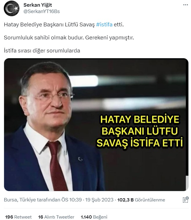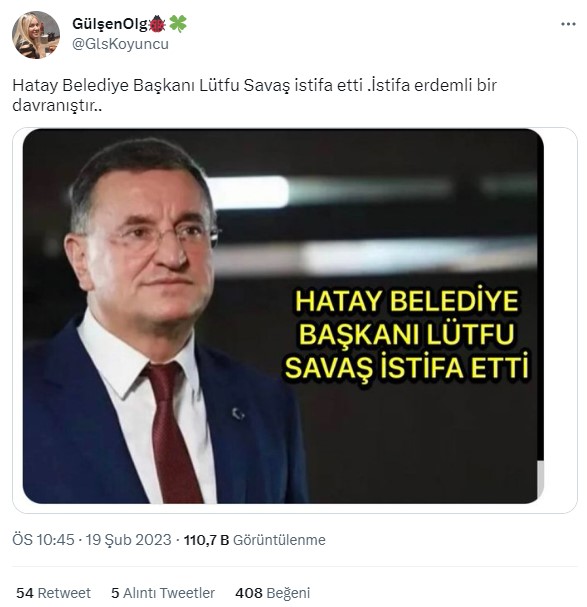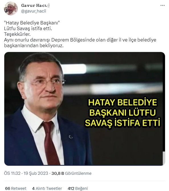 Geçtiğimiz gün sosyal medyada sıklıkla paylaşılan bir gönderide, Hatay Büyükşehir Belediye Başkanı Lütfü Savaş’ın istifa ettiği iddia edildi.