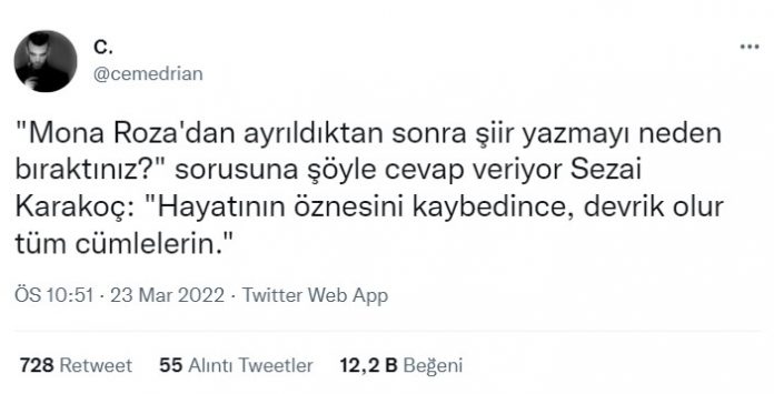 Twitter kullanıcısı, Sezai Karakoç’un Monna Rosa şiirine ilham olan kişiden ayrıldıktan sonra şiir yazmayı bıraktığını söylüyor. İddianın devamında, şairin “Hayatın öznesini kaybedince, devrik olur tüm cümlelerin.” dediğini aktarıyor.