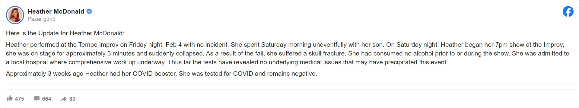 Olayla ilgili detaylı bir araştırma yaptığımızda Heather McDonald’ın facebook hesabından sağlık durumu hakkında bilgilendirme içeren yazıda şunlar aktarılmış: