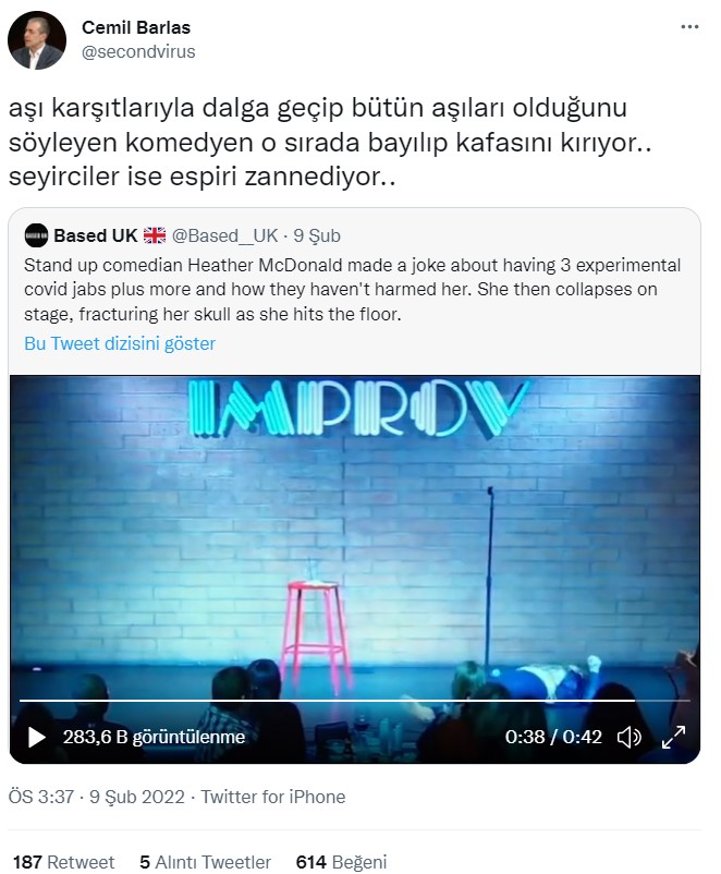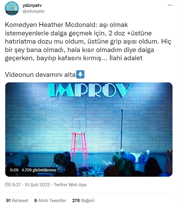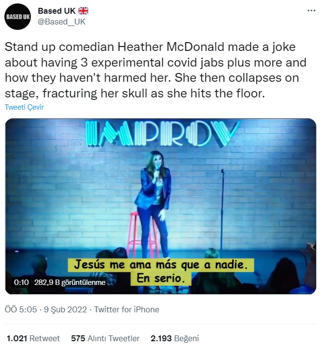 Yurtdışı kaynaklı bir Twitter hesabı olayla ilgili olarak, “Stand-up komedyeni Heather McDonald, 3 doz Covid aşısı olup hiçbir sorun yaşamadığı hakkında şakalar yaparken yere yığıldı ve kafasını çarptığı için kafatası zarar gördü” notuyla paylaşımda bulundu.