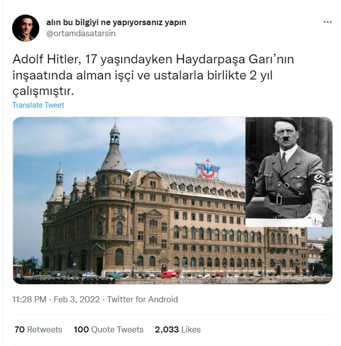 Bu tarihi gar, herkese birini hatırlatsa da kimseye Nasyonal Sosyalist Alman İşçi Partisi Lideri Adolf Hitler’i anımsatacağını düşünmemiştik. Ta ki Twitter’da paylaşılan bir gönderi ile ‘Hitler’in 17 yaşındayken Haydarpaşa Garı’nda çalıştığı iddiasın’ yayıldığını görene kadar…