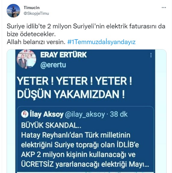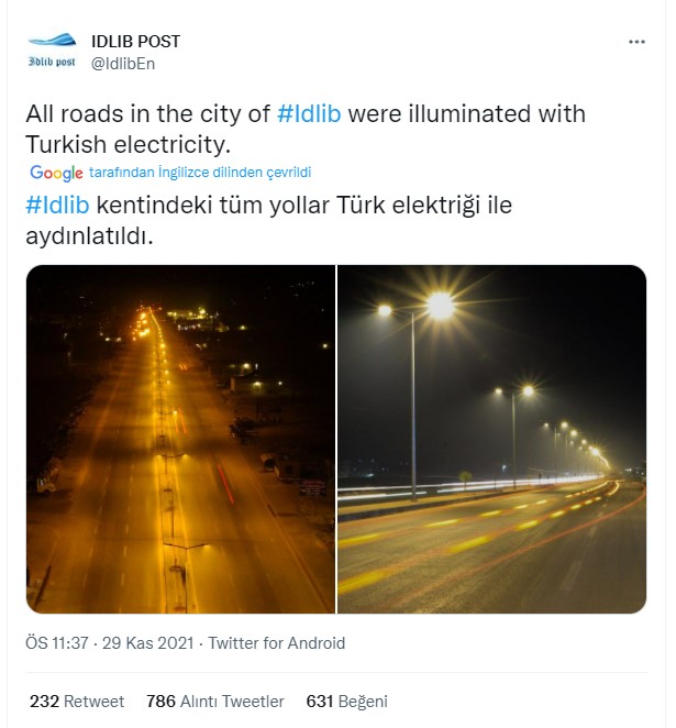 Sosyal medyada paylaşılan bir iddiaya göre Türkiye’den gelen elektriği İdlibliler ücretsiz. İddianın ortaya çıkışı İdlib Post’un paylaştığı bir tweete dayanıyor. Tweette İdlib Post “İdlib şehrinde tüm yollar Türk elektriği ile aydınlatıldı” ifadesini kullandı. Sosyal medya kullanıcıları bu ifadeyi Türkiye’nin İdlib şehrine bedava elektrik sağladığı şeklinde algıladı. Bu iddia da kullanıcıların tepkisine sebep oldu.