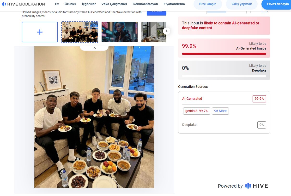 Yapay zeka dedektör uygulaması Hive Moderation da görselin yapay zeka ile oluşturulduğu sonucunu çıkarıyor.