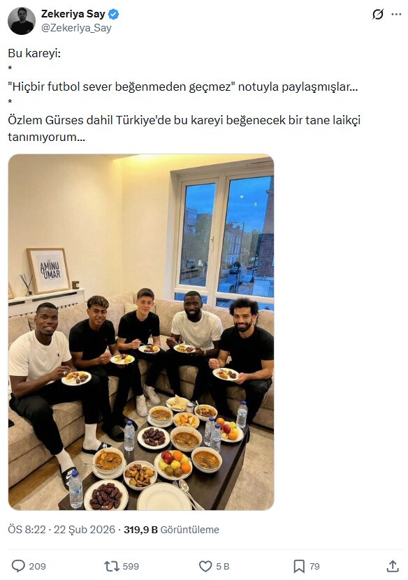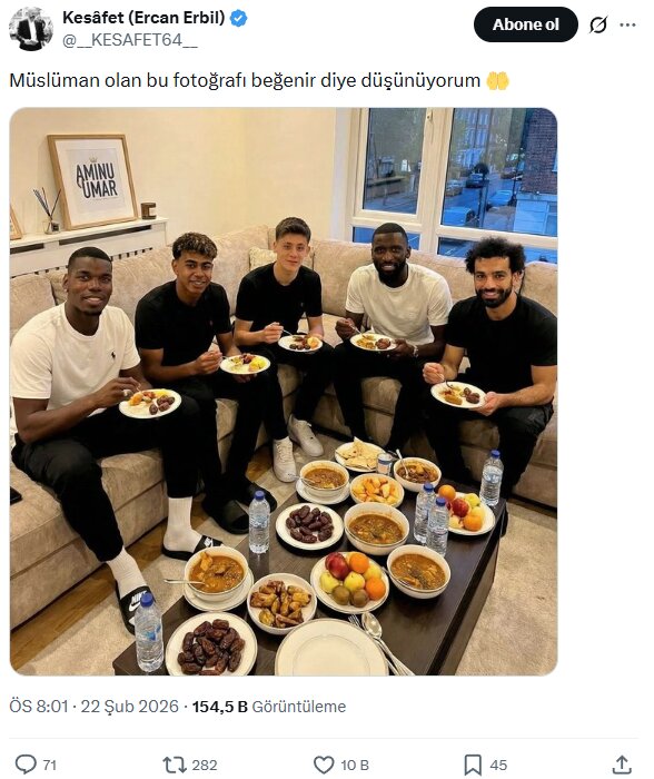 Sosyal medyada kısa sürede geniş bir yayılım alanı bulan bir fotoğraf, dünya futbolunun önde gelen isimlerini aynı iftar sofrasında buluşturduğu iddiasıyla paylaşıldı. Görüntünün, Muhammed Salah’ın evinde çekildiği ve aynı karede Paul Pogba, Lamine Yamal, Arda Güler ve Antonio Rüdiger’in yer aldığı öne sürüldü. Farklı liglerde ve ülkelerde forma giyen yıldız futbolcuların Ramazan ayında aynı evde bir araya geldiği iddiası doğru mu? İnceledik.