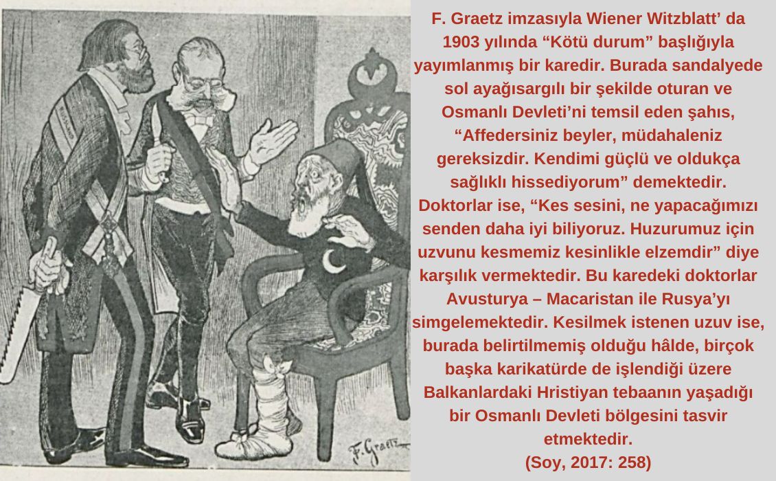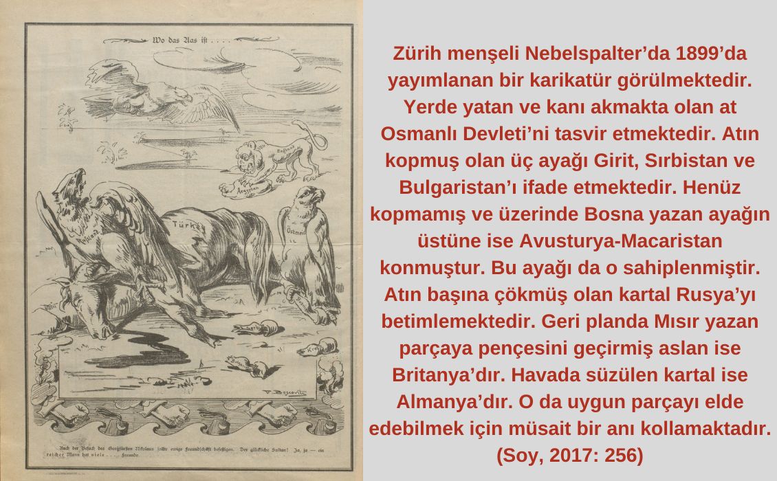 H. Bayram Soy’un “I. Abdülhamid Dönemi Karikatürlerinde Osmanlı -Alman Yakınlaşmasının Yansımaları” isimli çalışmasında da bu karikatürlerden birkaçının açıklamasını incelemek mümkün. Yazımızda da Soy’un açıklamalarından istifade ettik.