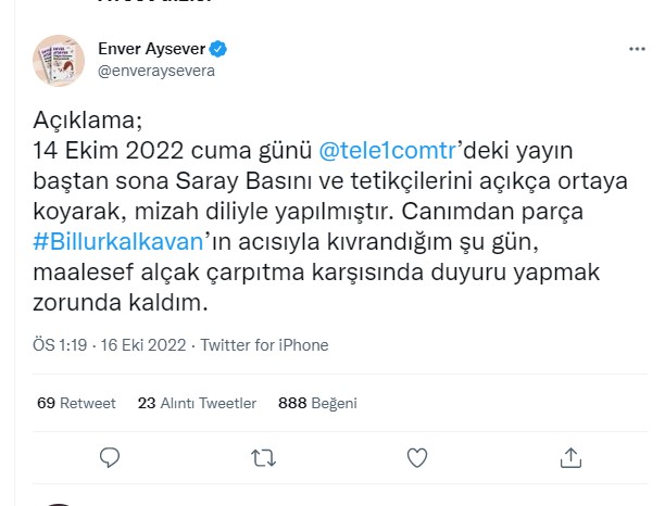 - Enver Aysever, 14 Ekim 2022 tarihindeki TELE1 yayınının yaklaşık ilk 50 dakikasında (İmamoğlu ve diğer muhalefet aktörlerini eleştirdiği süre boyunca) ironi yaptığını açıkladı.