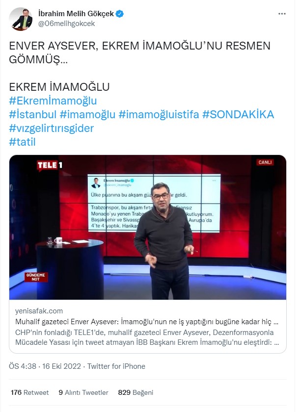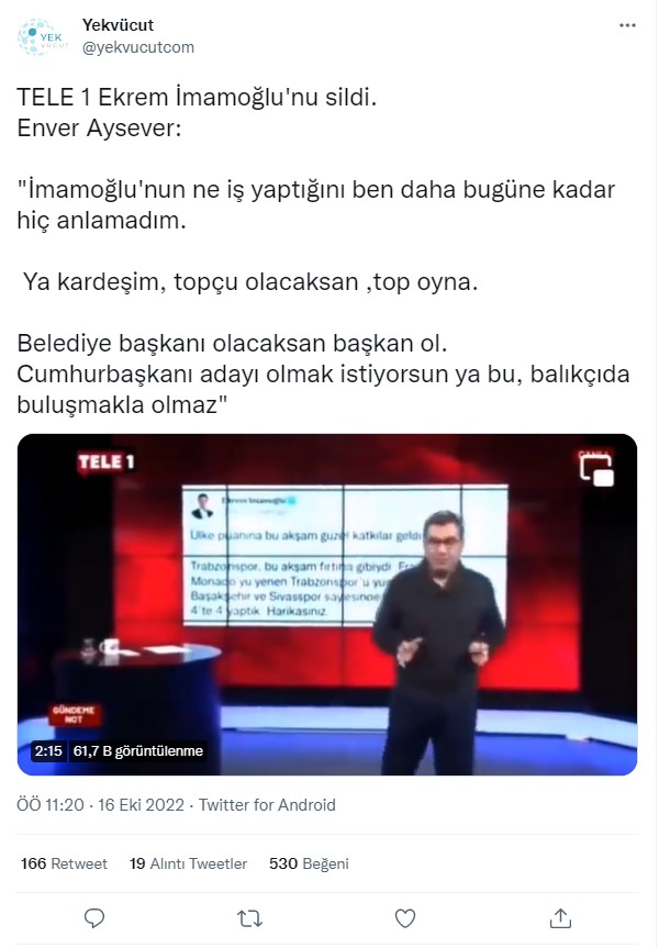 Sosyal medyada pek çok haber mecrasının ve kullanıcının paylaşımına göre TELE1 sunucusu Enver Aysever yayınında İstanbul Büyükşehir Belediye Başkanı Ekrem İmamoğlu, Ankara Büyükşehir Belediye Başkanı Mansur Yavaş ve CHP Genel Başkanı Kemal Kılıçdaroğlu’nu sözde eleştirdi. TELE1’in ve Enver Aysever’in muhalif tutumu bilindiği için paylaşımlar çokça gündeme geldi.