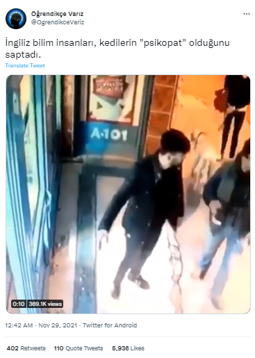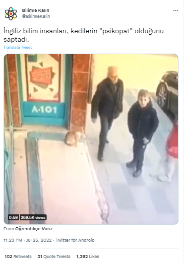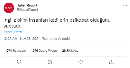 HaberReport, 2021 yılının Kasım ayında ‘İngiliz bilim insanları, kedilerin “psikopat” olduğunu saptadı,’ iddiasının yer aldığı bir paylaşım yaptı ve on binlerce etkileşim aldı. Paylaşım yapıldıktan 3 gün sonra @OgrendikceVariz adlı twitter hesabının da aynı içeriği bir video ekleyerek paylaştığı ve binlerce etkileşim aldığını görüyoruz. Geçtiğimiz günlerde @BilimleKalin adlı hesap bu paylaşımı tekrar yaptı.