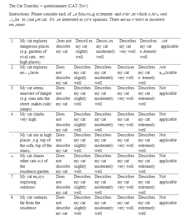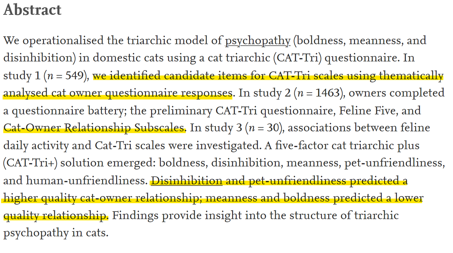 İddiada bahsedilen araştırma Journal of Research in Personality dergisinde yayınlanan ‘A domestic cat model of triarchic psychopathy factors’. İngiltere’deki Liverpool John Moores Üniversitesi ile Liverpool Üniversitesinin ortak yürüttüğü bu çalışmada, evcil kediler üzerinde triarşik kedi anketi (CAT-Tri) kullanarak triarşik psikopati modeli denendi. Kedi sahiplerinin verdiği cevaplara göre kediler beş farklı faktör üzerinden değerlendirildi: cesaret, disinhibisyon, kötü davranışlar, diğer evcil hayvanlara karşı tutum, insanlara karşı tutum.