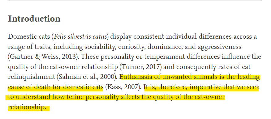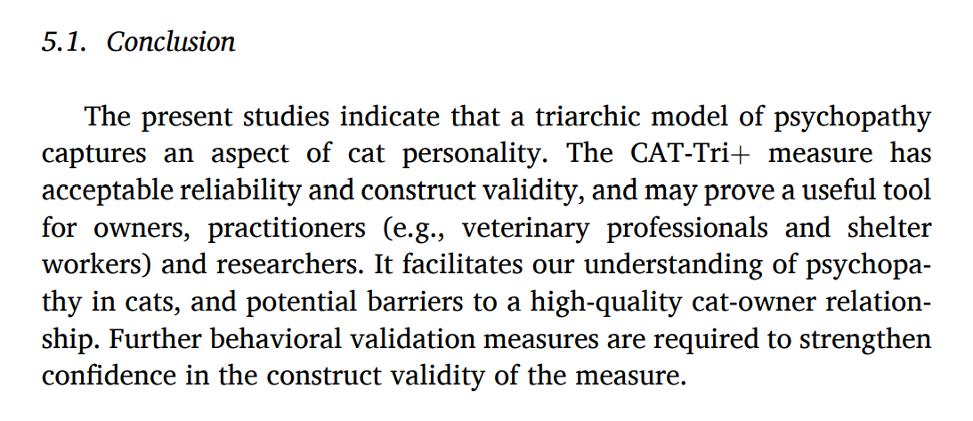 Sunulan raporun giriş kısmında, ‘istenmeyen hayvanlara uygulanan ötanazinin, evcil kedi ölümlerinin baş sebeplerinden biri’ (Kass, 2007) olduğunu ve bu sebeple, ‘kedigillerin kişiliklerinin kedi ve sahip arasındaki ilişki üzerindeki etkilerinin anlaşılmasının zaruri olduğu’ belirtilmektedir. Yani, bu alanda yapılan kapsamlı bir araştırma değil, sadece öncülük etmesi adına yapılan bir çalışmadır. Ayrıca ‘kedilerdeki psikopatlığı’ değil, kedi davranışları ve kedi sahipleri arasındaki ilişkiye etki eden faktörleri ele almaktadır. Bu sebeple, bu çalışmanın sonuçları üzerinden genelgeçer bir yargı yürütmek mümkün değildir. Son olarak, yapılan çalışmanın sonuçları arasında tüm kedilerin psikopat olduğuna dair bir ibare bulunmamaktadır. Aksine bu çalışma, kedileri bireysel olarak ele almaktadır.