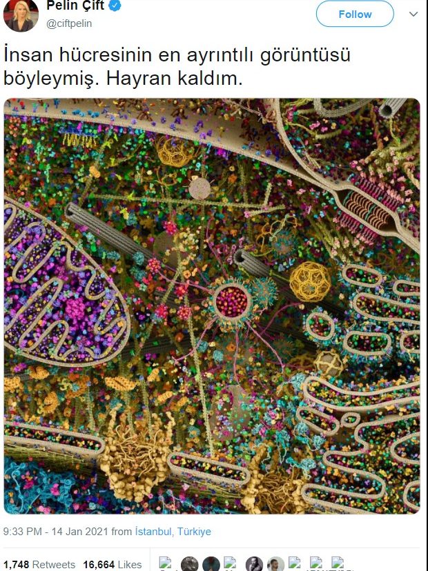 Tweet’te “Ökaryotik bir hücrenin içinden manzaralar” yazıyor. Bu görselin ise Evan Ingersoll ve Gael McGill tarafından modellendiği belirtiliyor.