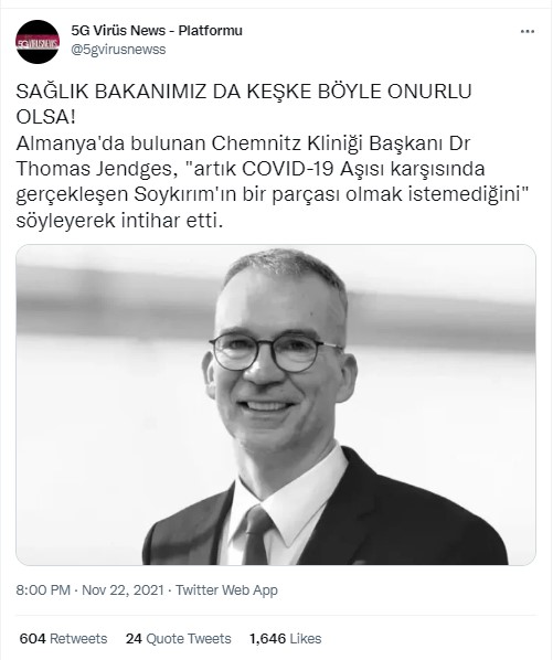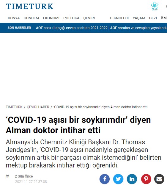 Son günlerde, Twitter’da bazı kullanıcıların paylaştığı iddiaya göre Alman Doktor Thomas Jendges bir intihar notu bırakarak intihar etti. Notta ise Jendges’in Covid-19 aşısı ile gerçekleştirilen soykırımın artık bir parçası olmak istemediği iddia edildi. İddia Twitter paylaşımlarının yanında Timetürk’de ve Doğru Haber’de de yer aldı. Kullanıcılar paylaşımlarında kaynak olarak bir video gösterdi. Videoyu aşağıda bulabilirsiniz.