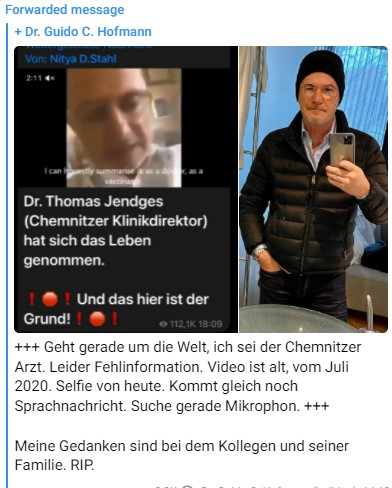 Alman gazetesi Bild’in 3 Kasım 2021 tarihli haberine göre Dr. Thomas Jendges Doğu Almanya’nın en büyük belediye hastanesi Chemnitz Kliniği’nin genel müdürüdür. Gerçekten de Nisan 2021’de Jendges bu hastaneye genel müdür olarak atanıyor. Chemnitz Belediye Başkanı Sven Schulze 2 Kasım 2021 tarihinde Dr. Thomas Jendges’in trajik ölümünü basın ile paylaşıyor. Jendges’in hastanenin üstünden düşmesinden dolayı hayatını kaybettiği biliniyor. Bild’in haberine göre kazanın nedeni bilinmese de bulguların intiharı gösterdiği söyleniyor.