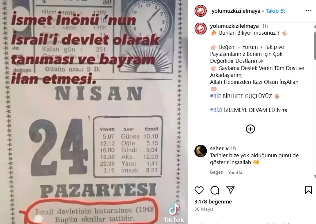 Sosyal medyada dolaşan bir iddiaya göre, İsmet İnönü’nün 24 Nisan’ı İsrail’in kuruluş günü olduğu için tatil ilan etmiş. Bir takvim görseli eşliğinde paylaşılan iddianın doğru olup olmadığını inceledik.