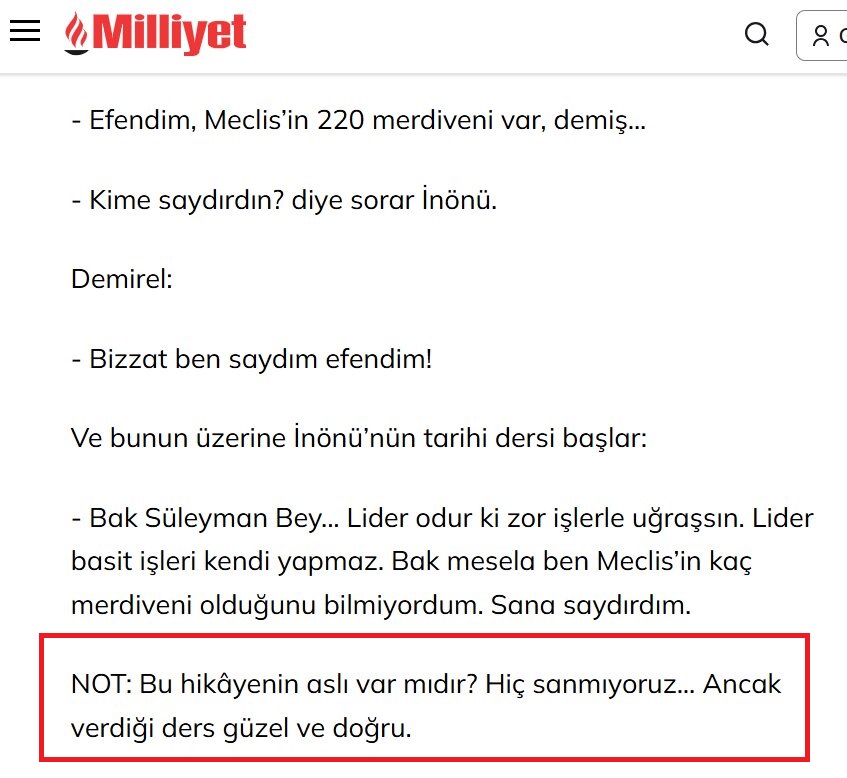Öyle ki yalnızca sosyal medya kullanıcıları değil, bazı köşe yazarları da söz konusu anıyı kaynağını belirtmeksizin ve doğruluğuna dair bir not düşmeksizin aktarmış durumda.