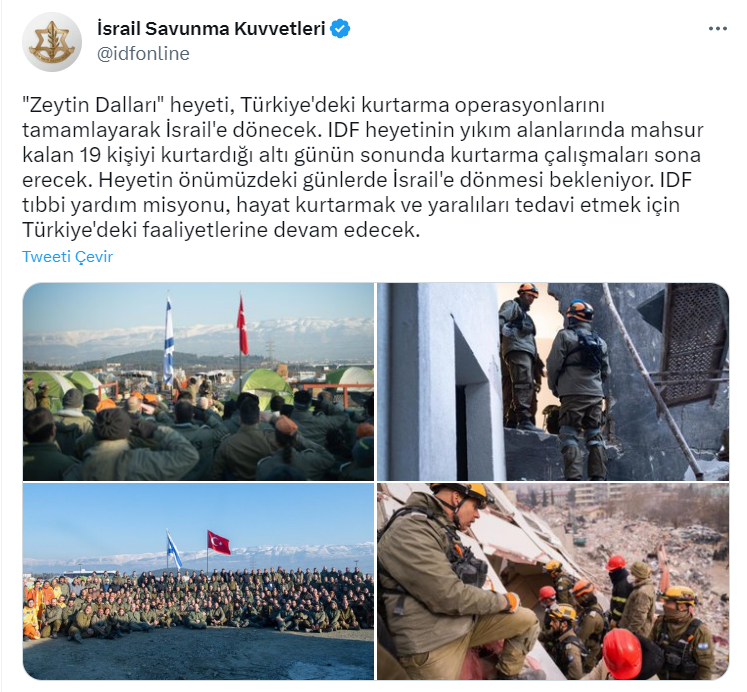 Önümüzdeki günlerde Zeytin Dalları isimli İsrailli yardım ekibinin sağlık çalışanları haricinde ülkeden ayrılacağı İsrail Savunma Kuvvetleri tarafından açıklanmış. Ancak deprem bölgesinde sağlık çalışanı olarak görev alan kişiler Türkiye’de kalmaya devam edecek.