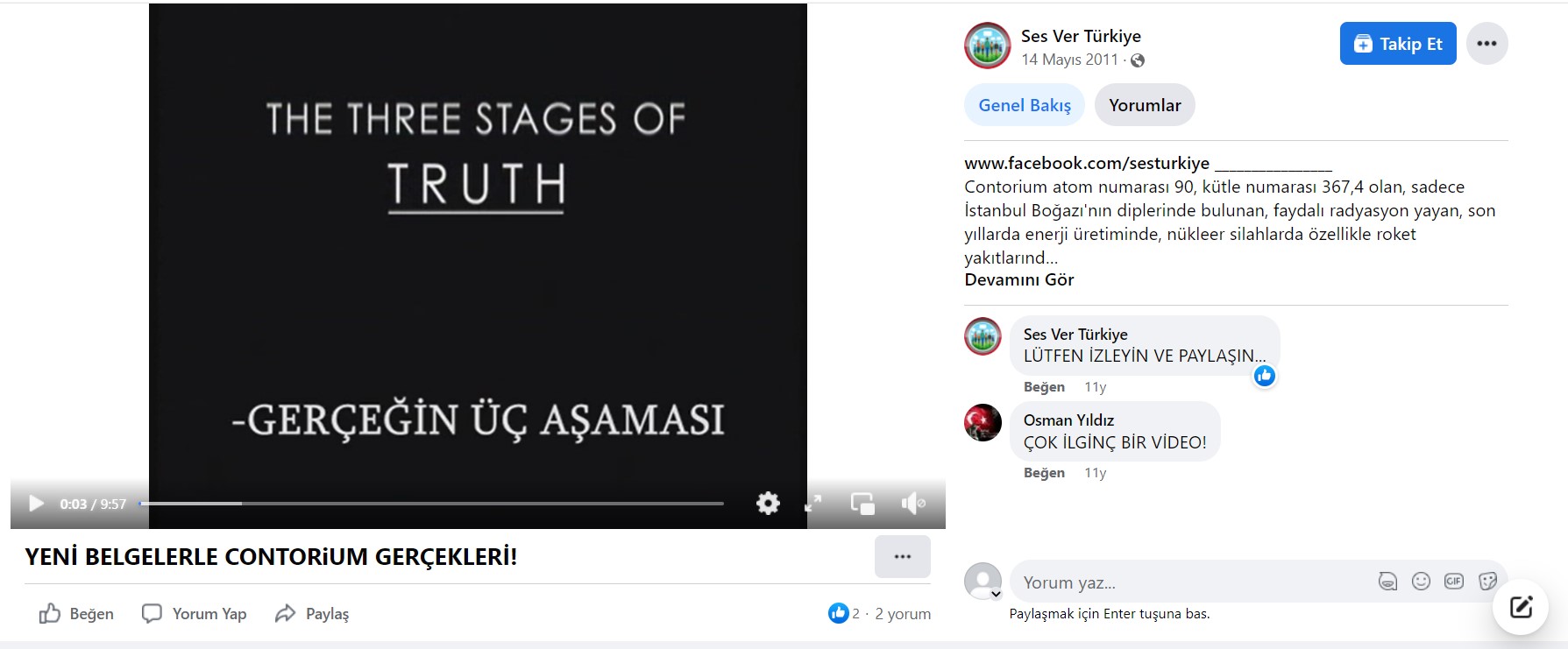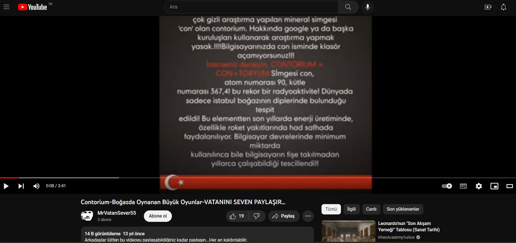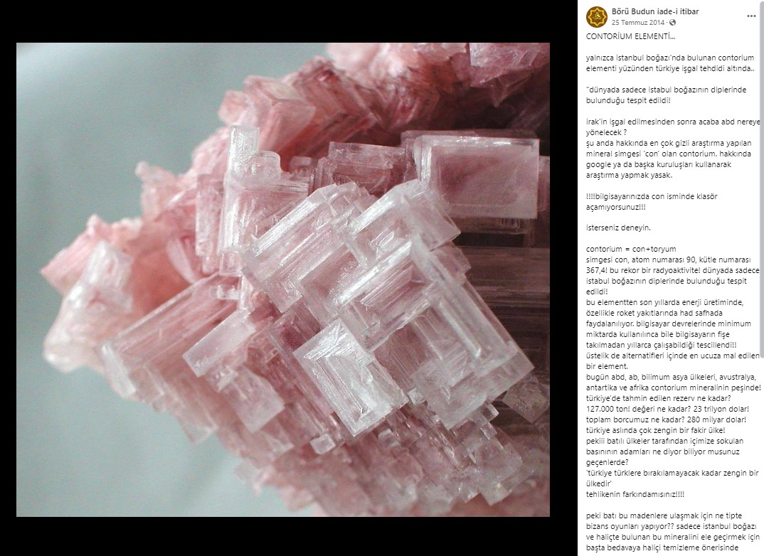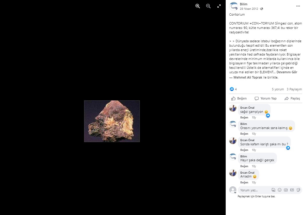 Arama motoruna “altın madeni” yazıp aradığımızda dünyanın ve Türkiye’nin en büyük altın madenleri, altının değeri, son gelişmeler gibi sonuçlar çıkar. Aynı işlemi altın yerine contorium üzerinden yaptığınızda ise resmi kurum verileriyle de haberlerle de karşılaşmazsınız. Hatta contorium elementinin periyodik cetveldeki yerini bile bulamazsınız. İddia metninde, atom numarasının 90 olduğu söyleniyordu. Ancak bu numara toryum elementine ait. Contorium, periyodik cetvelde yer almıyor. Çünkü böyle bir element yok. Bu sebeple bu kısımdan sonra contorium’dan “sözde” olarak bahsedilecektir.
