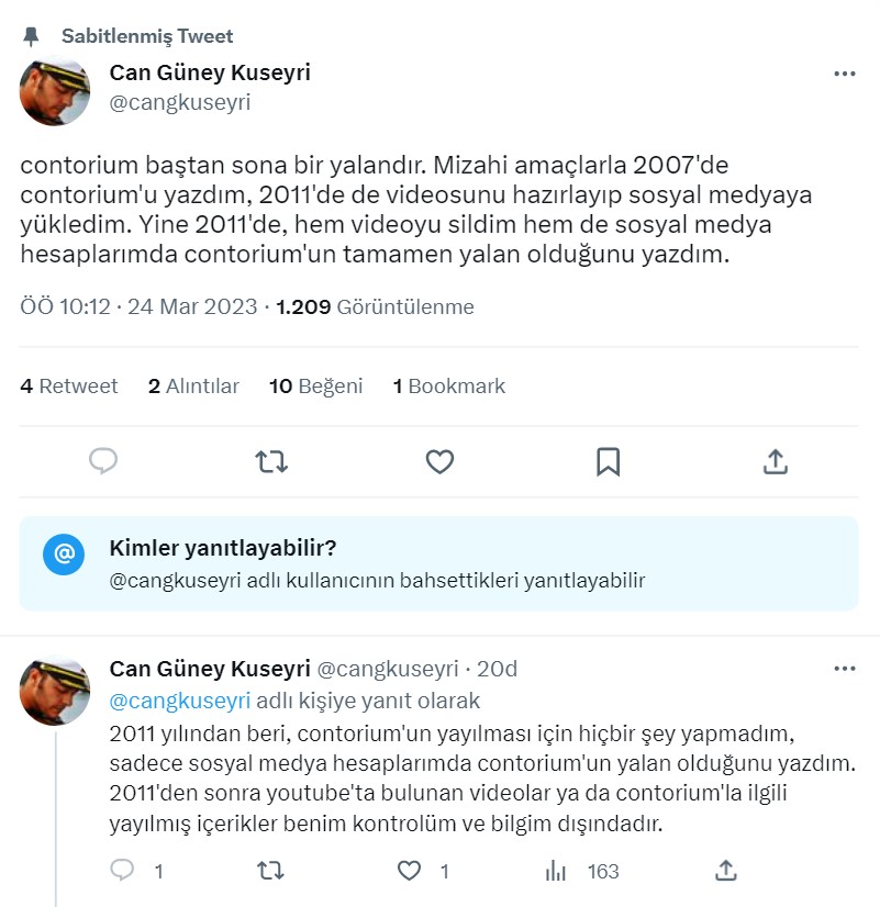 “Contorium baştan sona bir yalandır. Mizahi amaçlarla 2007’de contorium’u yazdım, 2011’de de videosunu hazırlayıp sosyal medyaya yükledim. Yine 2011’de, hem videoyu sildim hem de sosyal medya hesaplarımda contorium’un tamamen yalan olduğunu yazdım.