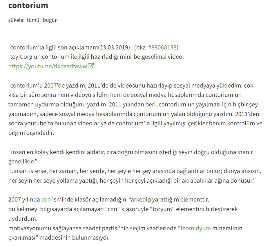 O entry dışında 2011 ve 2014 yıllarında çeşitli gazetelerde contorium’un tamamen uydurma olduğunu, sadece mizahi amaçla hazırladığımı açıkladım. 2020 yılında da teyit.org‘da contorium’un yalan olduğunu anlattım.