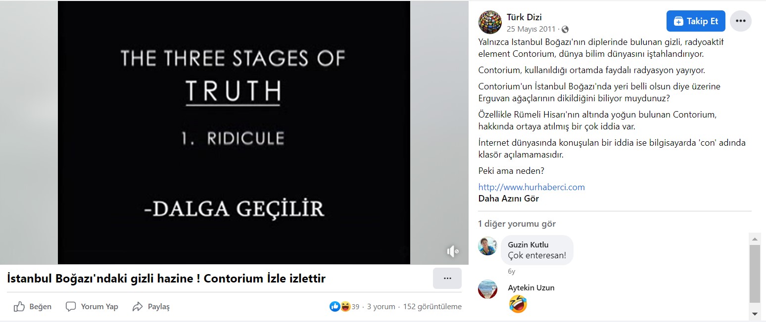 İstanbul Boğazı’nda contorium isimli bir madenin olduğu ve bunun çıkarılmasına izin verilmediği iddiası uzun yıllardır internet mecralarında paylaşılıyor. 2023 seçimleri ile ilgili yapılan bir sokak röportajında “contorium” madeninden bahseden bir kişinin konuşmasının viral videolar arasına girmesiyle konu yeniden gündeme geldi.