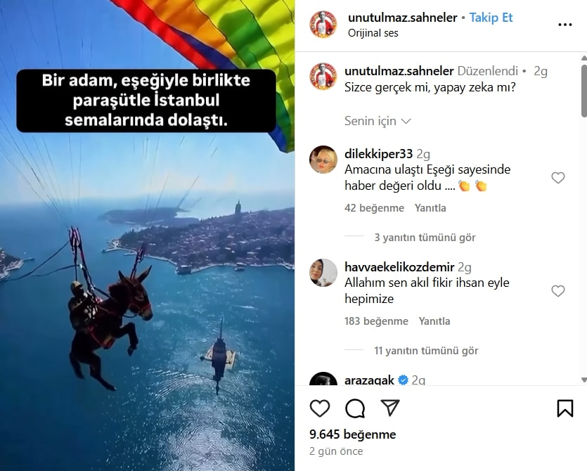 Son günlerde sosyal medyada büyük bir ilgi gören ve İstanbul’da eşeğiyle birlikte paraşüte binen bir adamın görüntüleri, kullanıcılar arasında hızla yayıldı. Ancak bu dikkat çekici görüntüler, gerçek olup olmadıkları konusunda bir tartışmayı da beraberinde getirdi.