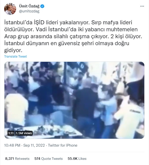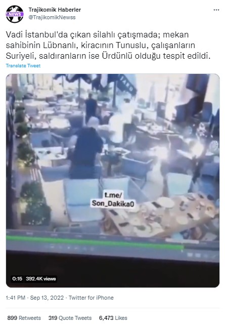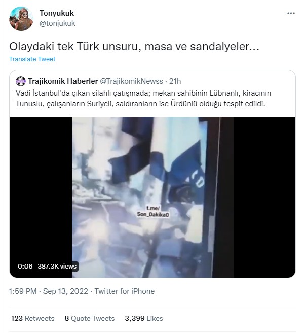 11 Eylül 2022’de Vadi İstanbul Alışveriş Merkezi’nde yer alan bir kafede silahlı çatışma meydana geldi. Olaya şahitlik edenler ve sosyal medyada olayın görüntülerine denk gelenler çatışmadaki kişilerle ve olayla ilgili çok sayıda paylaşım yaptı. Kavgaya karışanlar Türkçe konuşmadığı için, şahısların uyruklarıyla ilgili yapılan yorumlar en yaygın paylaşımlar arasında yer aldı. Sosyal medya kullanıcıları çoğunlukla kişilerin Arap olduğunu düşündü. Öyle ki Zafer Partisi Genel Başkanı Ümit Özdağ da silahlı çatışmaya karışan yabancıların ‘muhtemelen Arap’ olduğuna ve olayda 2 kişinin öldüğüne dair paylaşım yaptı. Bir diğer paylaşımda ise mekan sahibinin Lübnanlı, kiracının Tunuslu, çalışanların Suriyeli, saldıranların ise Ürdünlü olduğu iddia edildi.