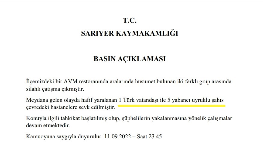 Olay gecesi Sarıyer Kaymakamlığı tarafından yapılan basın açıklamasına göre, iki farklı grup arasında çıkan silahlı çatışmada hafif yaralanan 1 Türk ve 5 yabancı uyruklu vatandaş çevredeki hastanelere sevk edilmiş ve şüphelilerin yakalanmasına yönelik çalışmalar başlatılmış.