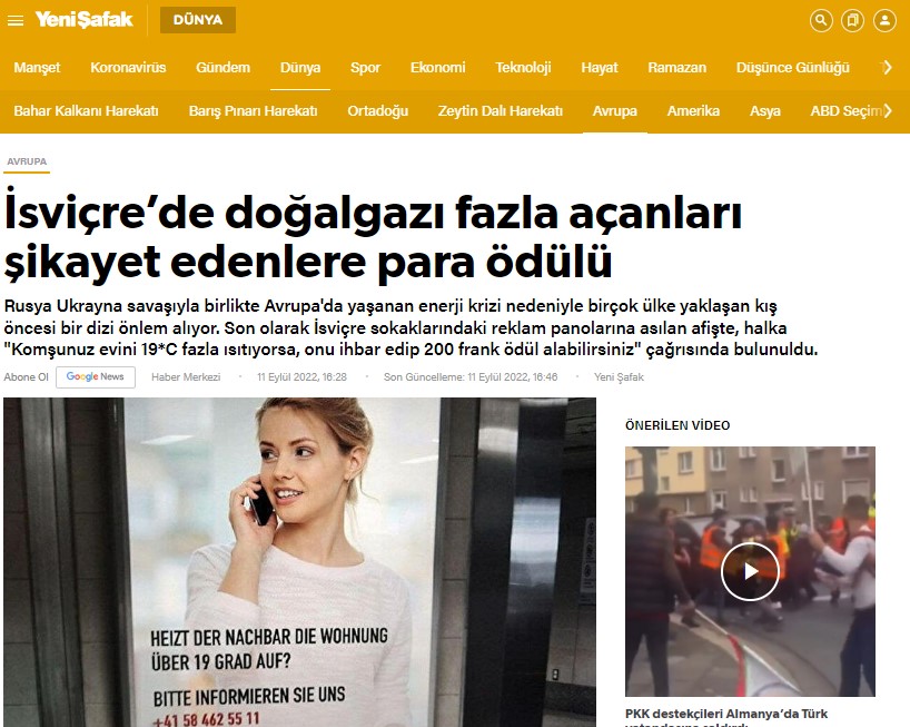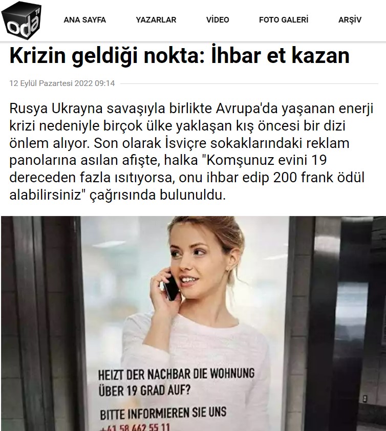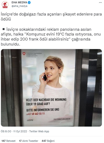 Sosyal medya paylaşımlarda, “İsviçre’de doğal gazı fazla açanları şikayet edenlere para ödülü, İsviçre sokaklarındaki reklam panolarına asılan afişte, halka “Komşunuz evini 19*C fazla ısıtıyorsa, onu ihbar edip 200 frank ödül alabilirsiniz” çağrısında bulunuldu” söylemlerine yer verildi. Konuya ilişkin Ekşi Sözlükte de başlık açıldığı görüldü.