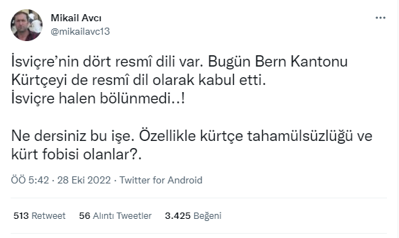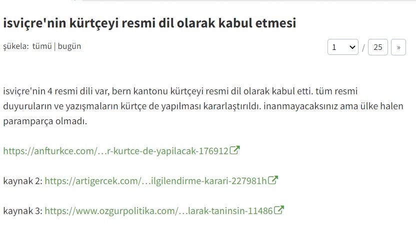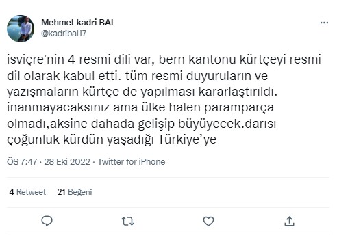 Sosyal medya platformlarında paylaşılan bir iddiaya göre İsviçre Kürtçe dilini resmi dil olarak kabul etti. Ekşi Sözlük’te de başlığı açılan iddiada İsviçre’nin dört resmi dili olduğunu ve ülkenin Bern kantonunun Kürtçeyi resmi dil olarak kabul ettiği söylenildi. Bazı haber mecraları da bu iddiayı haberleştirdi.