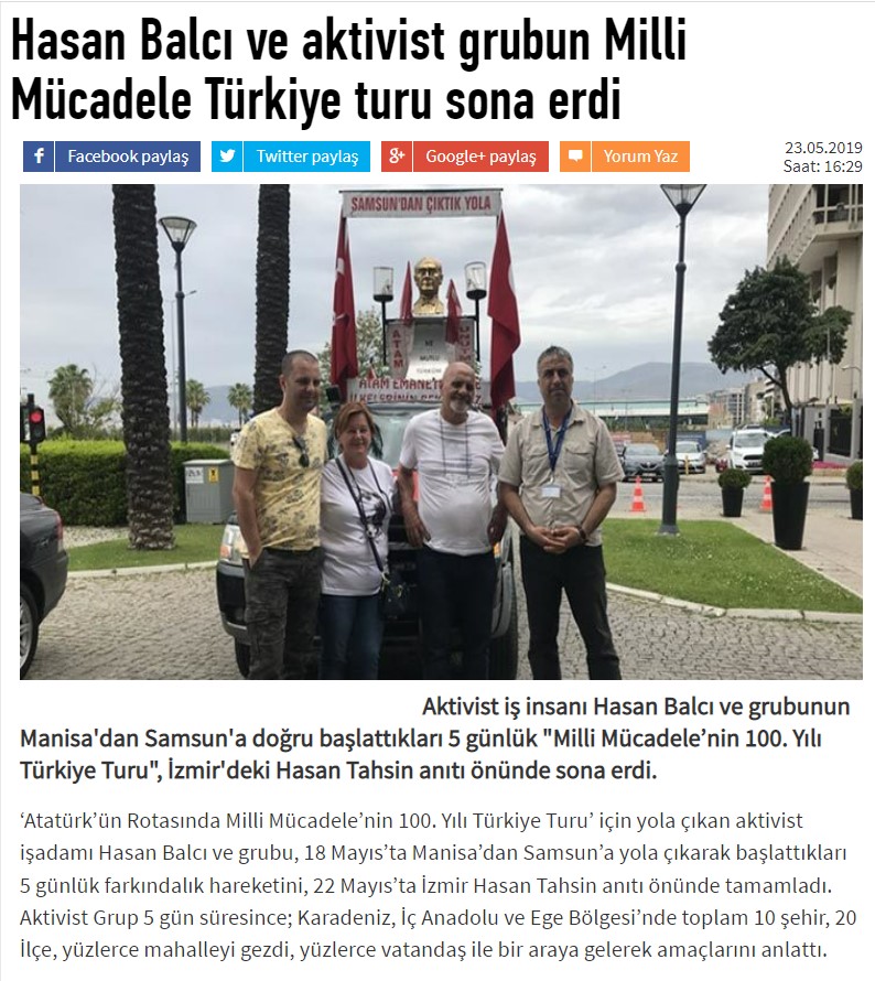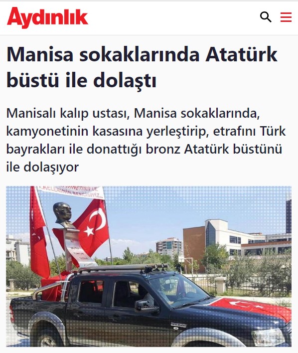 - Manisalı usta Hasan Balcı, Milli Mücadelenin 100. yılı anısına Atatürk büstü yerleştirdiği aracıyla Manisa’dan Samsun’a sembolik bir yolculuk yapmış.
