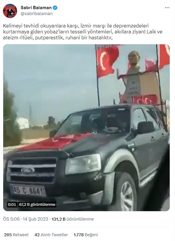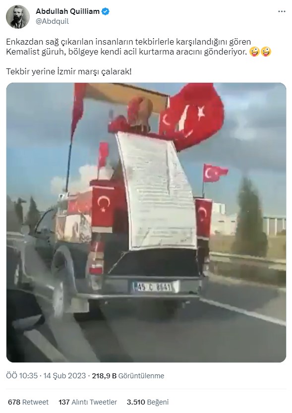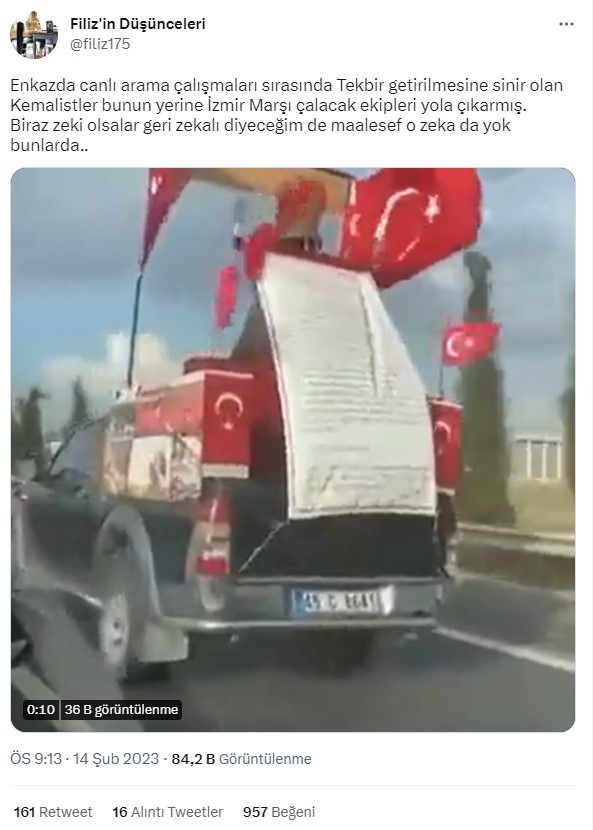 Twitter’da bazı kullanıcılar, üzerinde Türk Bayrağı, Atatürk’ün büstü ve fotoğraflarının yer aldığı; hoparlörlerinden yüksek sesle İzmir marşı dinleten bir aracın deprem bölgesine gittiğini iddia ettiler. İddia sahipleri, bunun enkaz altından çıkanların, kimi vatandaşlarca ‘tekbir’ ile karşılanması durumuna tepki olarak yapıldığını da ekledi.