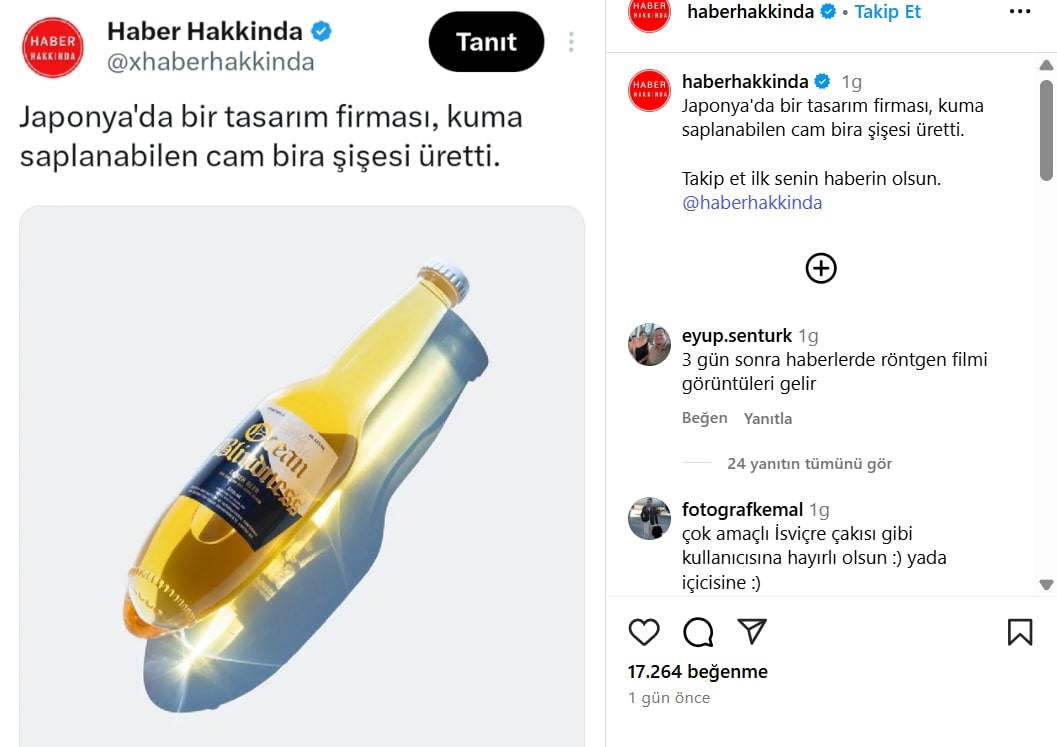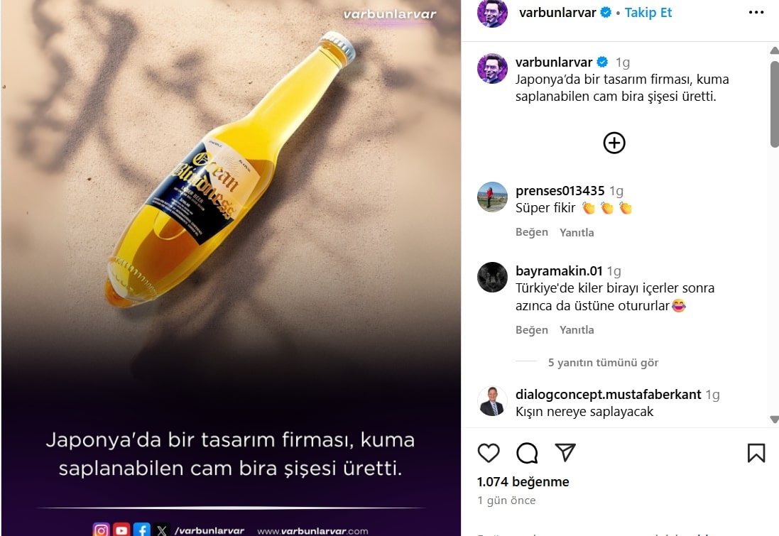 Sosyal medyada dolaşıma giren bir paylaşıma göre, Japon bir tasarım firması kuma saplanabilen bira şişesi üretti. Paylaşım, bu ürünün Japonya’da satışa çıktığı şeklinde algılandı. Bu da beraberinde çokça yorum ve beğeni getirdi.