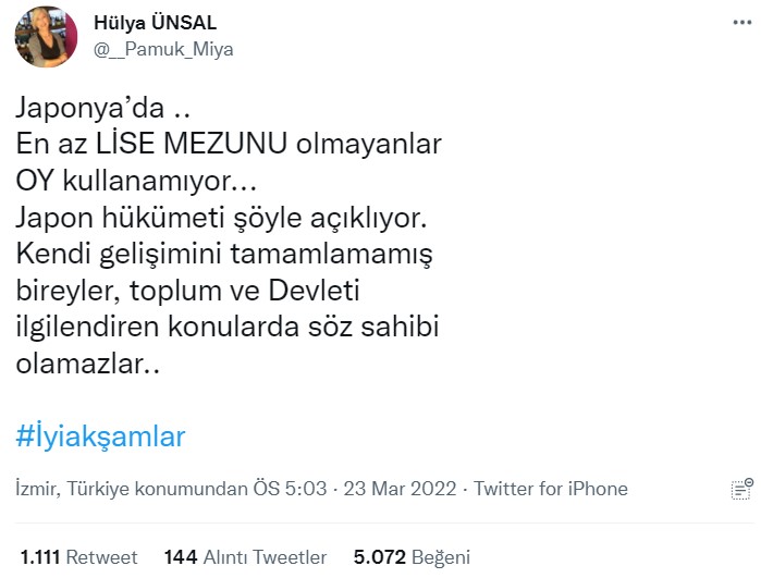 Japonya’da yaşadığını söyleyen bir kişinin başlığa yazdığı ingilizce yazıda, “Savaştan sonra seçme yaşı 20’ydi ama lise mezunu olmak ön şart değildi. Bugün 18 yaşını doldurmuş herhangi bir Japon vatandaşı oy kullanma hakkına sahiptir. Ayrıca, oy kullanmak için kayıt olmalarına gerek yok. 18.yaş günlerinde otomatik olarak kaydedilirler” ifadeleri yer alıyor.