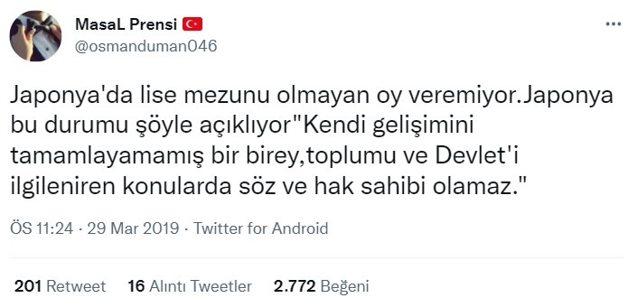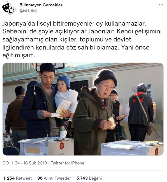 Paylaşımda, ‘Japonya’da lise mezunu olmayanların oy kullanma hakkına sahip olmadığı’ bilgisi yer alıyor. 2019 yılından bugüne Kafa karışıklığına sebebiyet veren bu söylemi araştırdık.