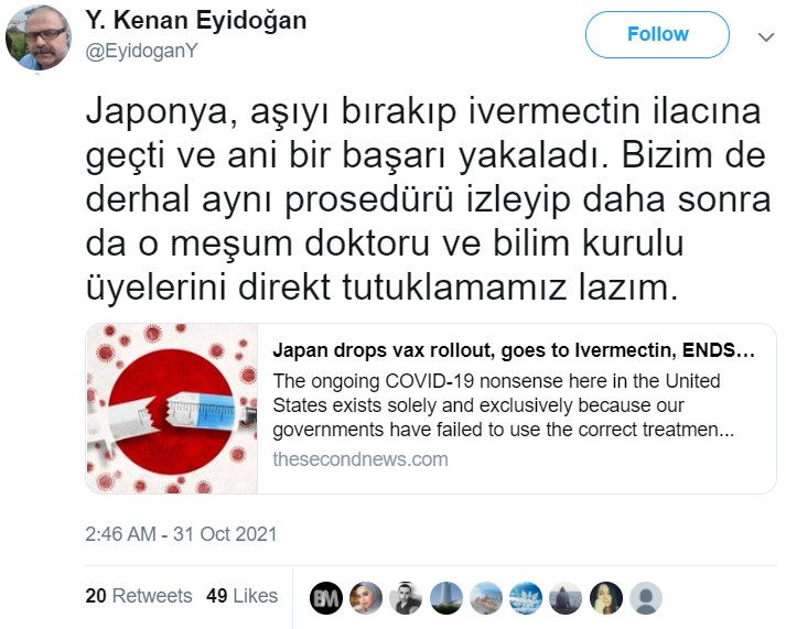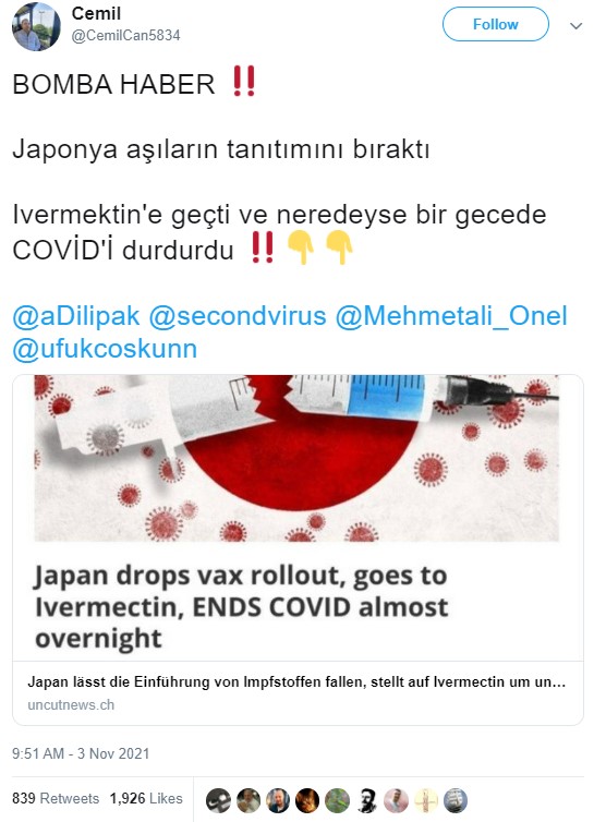 Koronavirüs aşıları ile alakalı manipülasyonlar ve dezenformasyonlar hız kesmeden devam ediyor. Hepimizin sağlığını yakından ilgilendiren bu hassas ve önemli olan konuda, aldığımız duyumların gerçek ya da uydurma olduğunun doğrulamasını yapmamız büyük önem taşıyor. Uzun süredir aşı karşıtlarının, bir enstrüman olarak kullandığı “Ivermectin” isimli ilaçla alakalı yanlış bilgi yaydığına şahit oluyoruz. Bu yanlışlıklar serisinin son paylaşımı da “Japonya’da aşıların bırakılıp İvermektin tedavisine geçildiği” yönünde ele alınmış. Bahse konu olan bu iddiada aşı karşıtları, İvermektin için “Neredeyse bir gecede hastalığı durdurdu” şeklinde bir görüş beyan etmişlerdir.