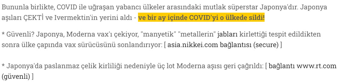 Söz konusu yazıda doğrulamaya muhtaç onlarca iddia öne sürüldüğü görülüyor. Japonya Sağlık Bakanlığı’nın (MHLW) resmi internet sitesinde, aşıların rafa kaldırıldığı ve İvermektin’in tedavi amaçlı kullanıldığı ile alakalı bir veri bulunmamaktadır. Aksine, site dikkatli incelendiğinde halihazırda mevcut olan Moderna, Astrazeneca ve Pfizer aşılarının kullanımda olduğu belirtilmektedir.