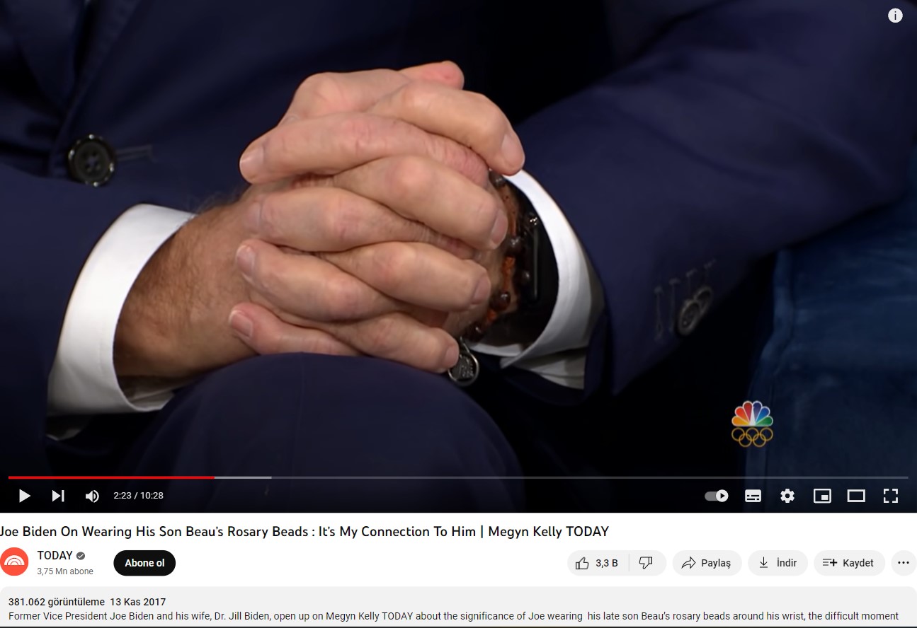 Toplantı videosunu izledik. Biden, fotoğraflarda net bir şekilde görülen tespihi gösterip oğlunun ölümünden sonra hala tespihlerini taktığını belirtiyor.