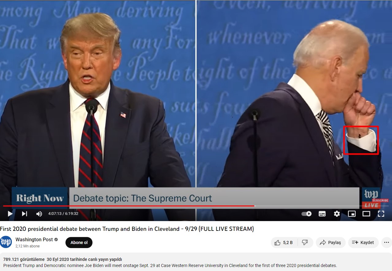 Video, 29 Eylül 2020’den. Görüntü, Donald Trump ve Joe Biden’ın başkanlık yarışındaki tartışma yayınından alınmış. Aslına bakılırsa Joe Biden’ın bileğindeki siyah nesne, tartışmanın içerisinde zaman zaman görülüyor.