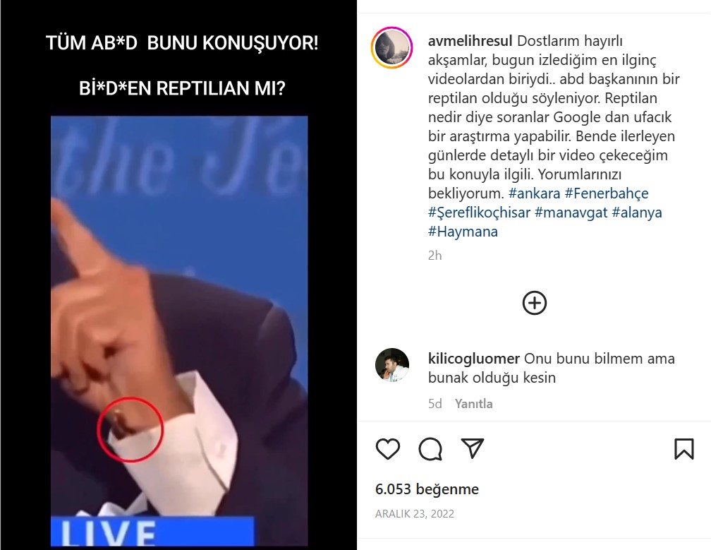 Joe Biden’ın gömlek manşetinin ucundan görünen siyah karartının sürüngenin bir parçası olduğu fikri üzerinden onun da sözde reptilian’lardan biri olduğu üzerinde duruluyor. Ne var ki incelememizde de görüldüğü üzere, Joe Biden’ın şekil değiştiren bir sürüngen sanılmasının sebebi olan parça sadece bir tespih.