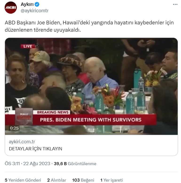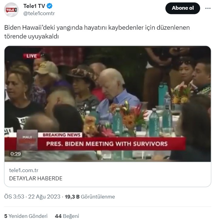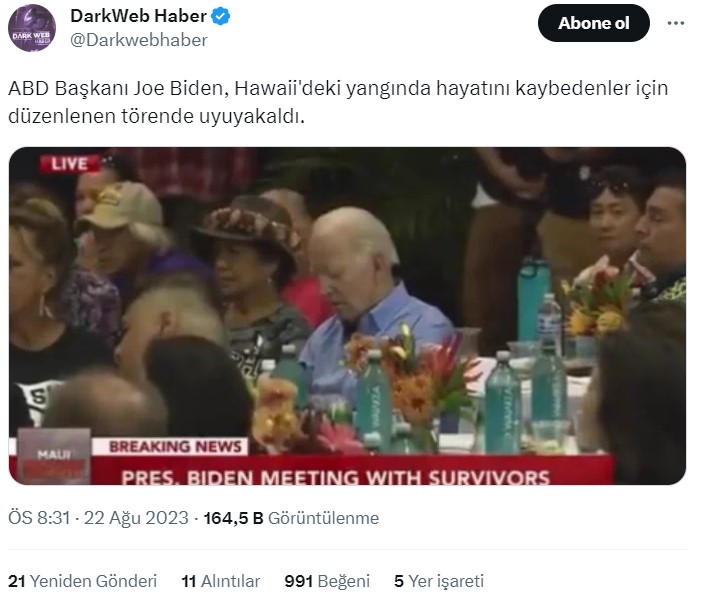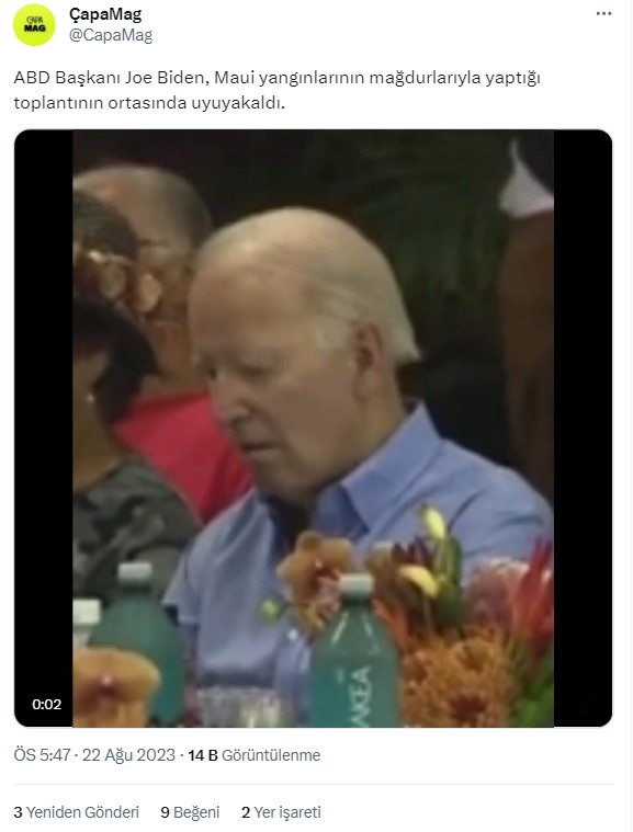 Sosyal medyada yayılımda olan bir videoda, 2023 Hawaii Maui Adası orman yangınlarında hayatlarını kaybedenler için düzenlenen törende ABD Başkanı Joe Biden’ın uyuyakaldığı iddia edildi. İddia, Türkiye’de ve yurt dışında sosyal medya kullanıcıları tarafından paylaşıldı.