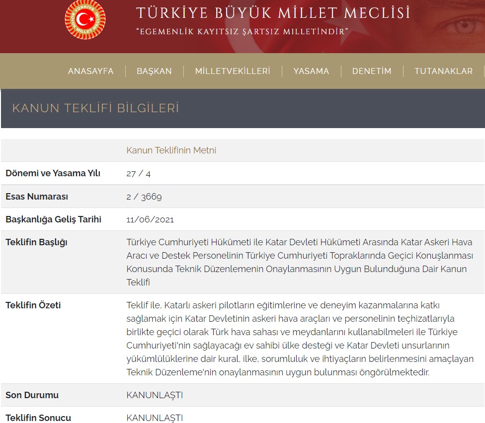 - Resmi Gazete’nin 15 Eylül’de yayımlanan mükerrer sayısında, Türkiye Cumhuriyeti Hükümeti ile Katar Devleti Hükümeti Arasında Katar Askeri Hava Aracı ve Destek Personelinin Türkiye Cumhuriyeti Topraklarında Geçici Konuşlanması konusunda Teknik Düzenlemenin onaylanmasına karar verilmişti.