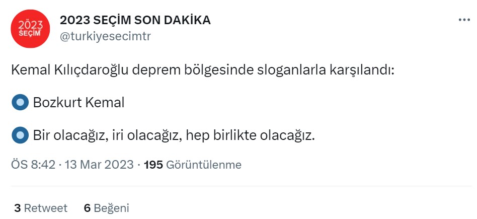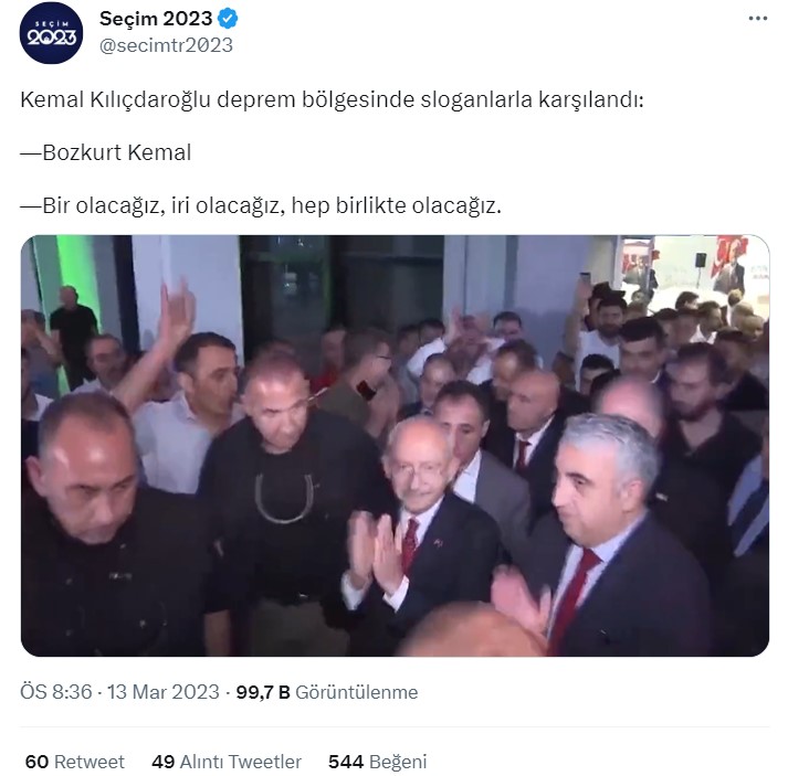 Siyasiler hakkında ortaya atılan pek çok söylemi inceliyoruz. Geçtiğimiz günlerde yapılan bir paylaşımda, CHP Genel Başkanı ve Millet İttifakı’nın Cumhurbaşkanı adayı Kemal Kılıçdaroğlu’nun, deprem bölgesinde ‘Bozkurt Kemal’ sloganlarıyla karşılandığı öne sürüldü.